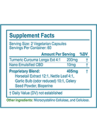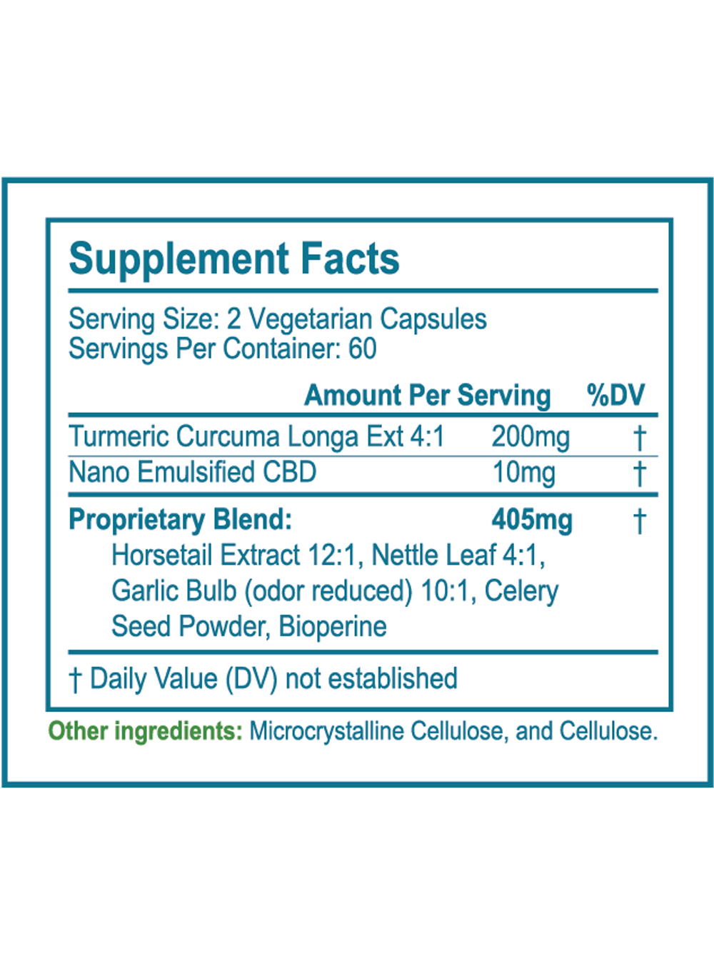 Our all-natural formula of Turmeric, CBD, Horsetail, Nettle Leaf, Garlic Bulb, Celery Seed, and Bioperine work as a potent natural anti-inflammatory that help to provide relief from joint pain, muscle soreness, body aches, and headaches. These ingredients also help to remove excess fluids and uric acid from the body which can erode the joints, clear toxins from the blood, and provide antioxidants to cells. CBD adds an additional layer of relief. Combined, they are also a great source of the vitamins and minerals that your body needs.*